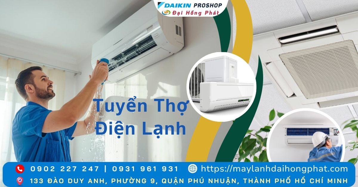 Bạn đang tìm kiếm một công việc ổn định, thu nhập cao và có cơ hội phát triển nghề nghiệp lâu dài trong ngành điện lạnh? Hãy đến ngay với Công Ty Máy Lạnh Đại Hồng Phát – chúng tôi đang tuyển thợ điện lạnh, tuyển thợ phụ điện lạnh và nhiều vị trí liên quan tại TP.HCM. Với hơn 10 năm kinh nghiệm trong lĩnh vực thi công – lắp đặt – bảo trì máy lạnh, Đại Hồng Phát luôn là lựa chọn lý tưởng cho những ai muốn tìm kiếm việc làm thợ điện lạnh TPHCM.